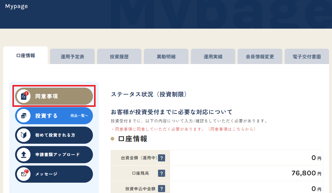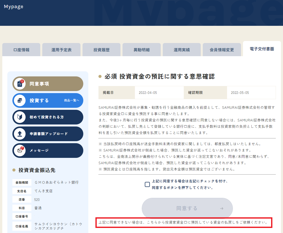 同意事項に同意いただくことで、再度ご投資することが出来るようになります。